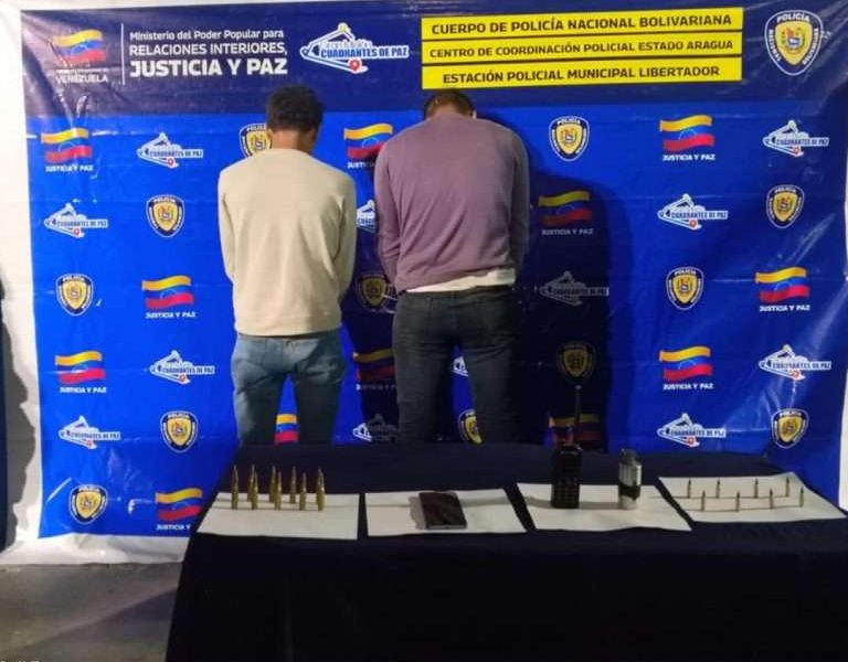 Los detenidos están identificados como José Javier Navarro Tovar (18) y Onal Alexander Guillén Ceballos (29), quienes fueron capturados en el sector La Croquera, Palo Negro (Aragua). Estas personas cargaban un bolso que, al ser revisado por los agentes de la Polinacional, les encontraron 10 cartuchos destinados a fusiles 7,62×51, ocho balas calibre 5,7×28, una granada aturdidora, un radio portátil y un celular.